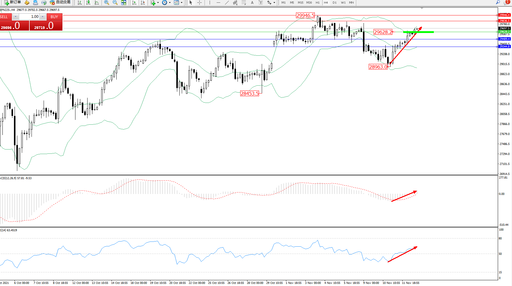 日经225指数11月12日(周五)收盘上涨360.64点,涨幅1.23%,报29638.50点。周五公布的一项路透调查显示,由于汽车出口量下降,日本10月出口增速可能放缓,结束连续七个月的两位数扩张步伐。由于长期的供应紧张、原材料价格上涨,以及日圆疲软导致进口成本增加,使企业利润受到挤压,预计该数据将凸显出日本出口型经济所面临的风险。贸易数据可能会显示,10月出口同比增长9.9%,为连续第八个月增长,但与9月13.0%的增幅相比增速有所放缓。