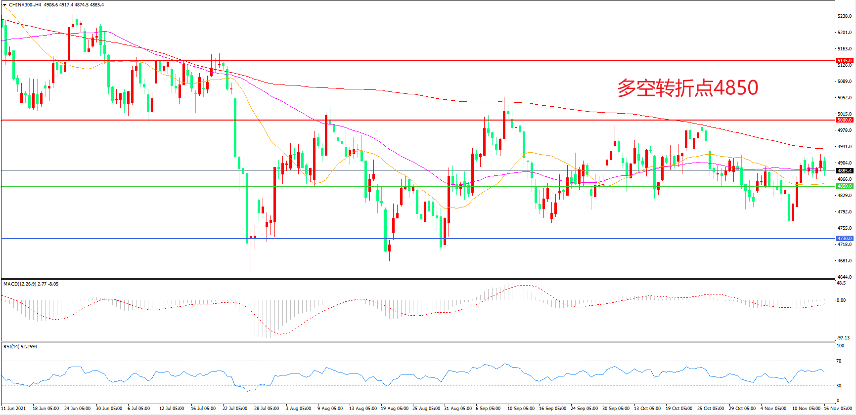 4小时图看,沪深300突破4850之后延续区间震荡,短期走势有所回暖,200均线成为上方阻力,4850成为多空分水岭,MACD红柱增加,RSI指标走平,日内延续震荡概率较大。