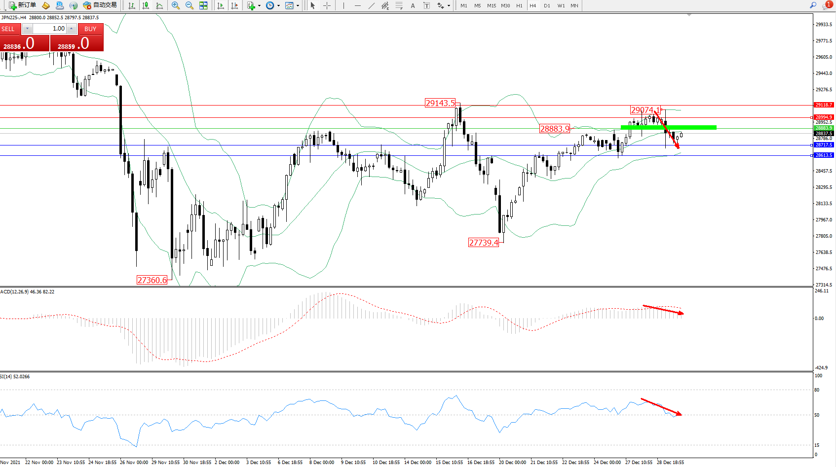 技术点评:多头动力延续布林带指标通道中上轨区间持续震荡上扬,高位抵达29074位置节点后遇阻回撤,短期空头动力有伺机入场下行迹象,布林带指标呈收口走势中,MACD指标处于多头区域维持整理缓慢下移,即将触及0轴线附近节点,RSI指标处于多头区域维持震荡回撤至50均衡线附近徘徊中;