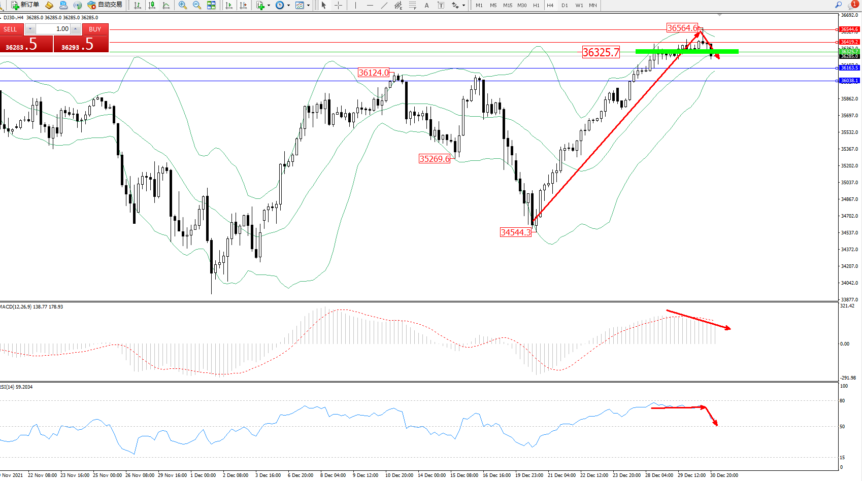 技术点评:多头动力延续布林带指标通道中上轨区间持续震荡上扬,高位抵达36564位置节点遇阻回撤,短期空头动力开始伺机入场,触及布林带指标呈中轨附近节点后有继续回撤迹象,布林带指标呈收口走势中,MACD指标处于多头区域维持整理徘徊,RSI指标处于多头区域维持震荡平移后开始急速回撤下行;