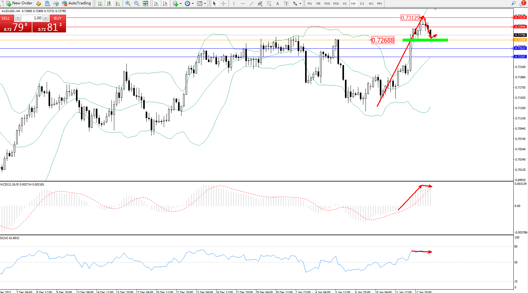 备选策略:0.72688下方看跌,目标0.73522、0.72357