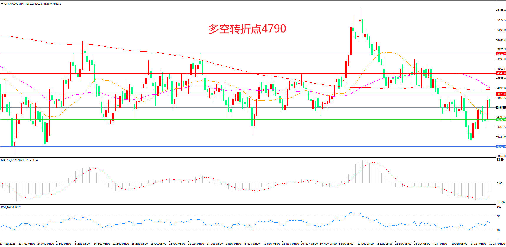 4小时图看,沪深300呈现宽幅震荡形态,4875成为下方阻力,4790成为下方支撑, MACD绿柱缩短,RSI指标走平,日内延续震荡概率较大。