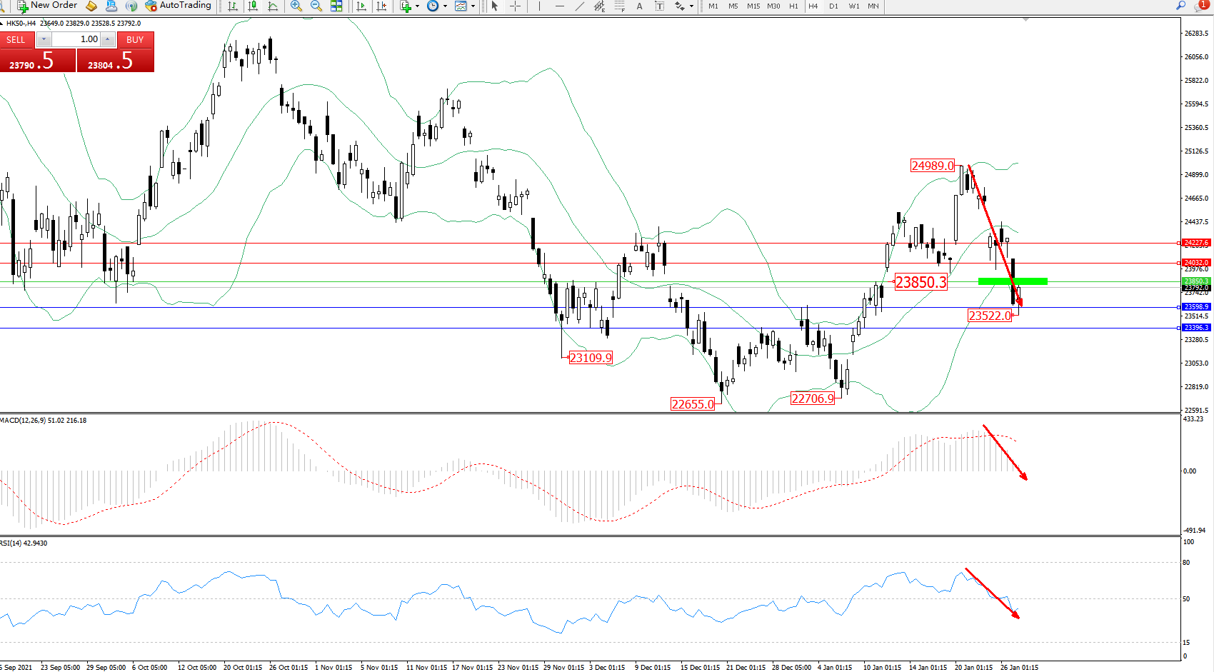 技术点评:高位空头动力持续震荡下挫,低位抵达23522位置节点后得到支撑回升,但下行趋势态势良好,短期有进一步向下移动态势,布林带指标呈缓慢张口走势中,MACD指标处于多头区域空头动力急速震荡下行至0轴线附近徘徊,RSI指标空头动力持续震荡下行至50均衡线下侧徘徊中;