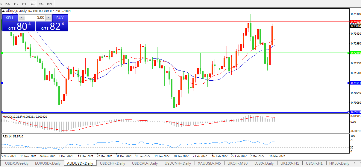 澳元领涨,迈向2020年以来最大两日涨幅,两天累计上涨2.5%;澳元兑美元涨1.2%至0.7375;澳元兑日元上涨1%至87.446,为四年来的最高水平。美联储周三自2018年以来首次加息之后,澳洲联储主席Philip Lowe可能面临更大的提前加息压力。