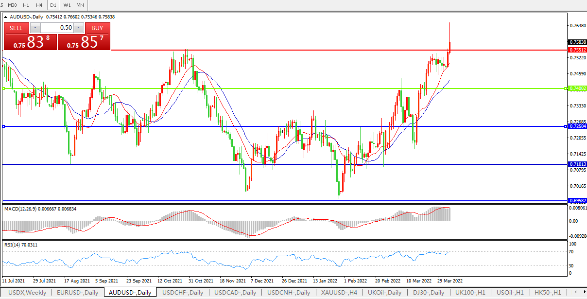 交易策略:0.7400上方看涨,目标0.7550、0.7650