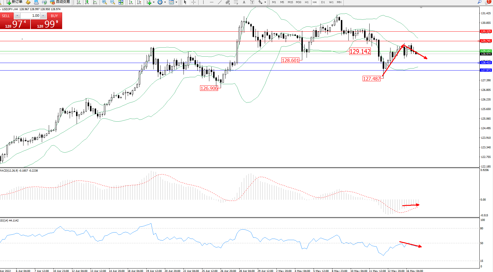 交易策略:129.142下方看跌,目标128.433、127.973
