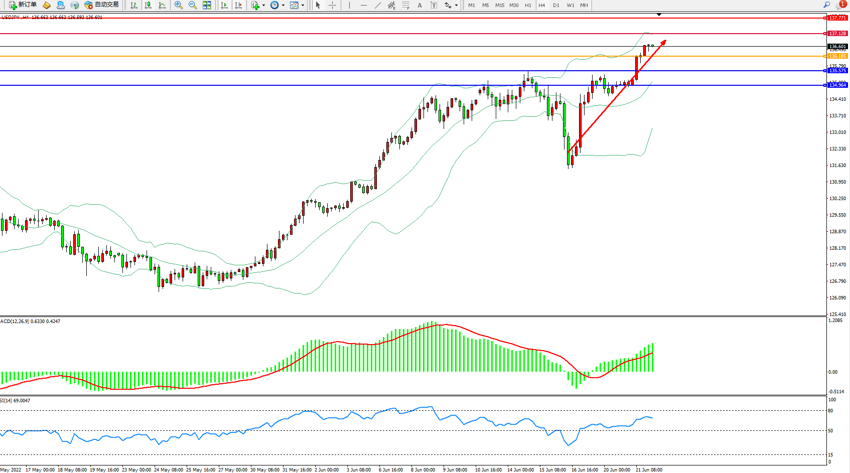 4小时图看:多头动力延续布林带指标通道中上轨区间震荡上扬,短期多头动力未见有止步迹象,布林带指标呈张口走势后开始逐渐收口上移,MACD指标处于多头区域维持震荡不断向上拉升,RSI指标处于多头区域维持震荡上行;