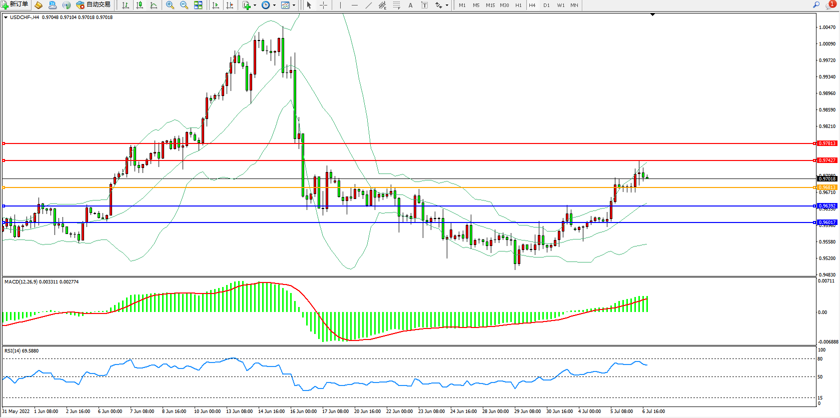 交易策略:0.96813上方看涨,目标0.97427、0.97813
