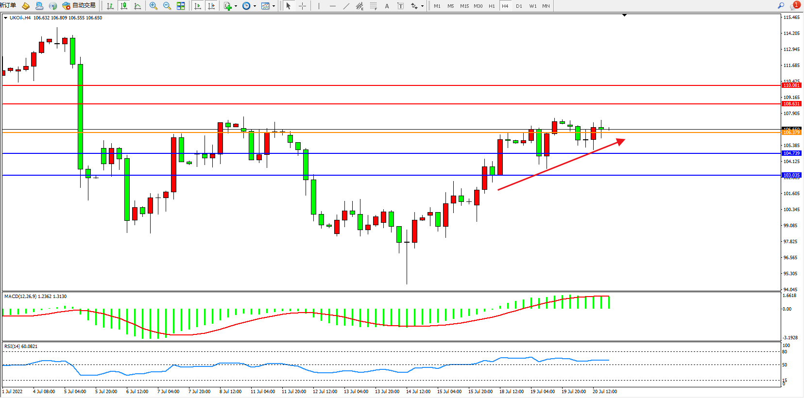4小时图看:多头动力维持震荡上移态势良好,短期高位维持整理平移,多头拉升走势或将延续,MACD指标处于0轴线上側徘徊,RSI指标处于50均衡线上側窄幅整理;