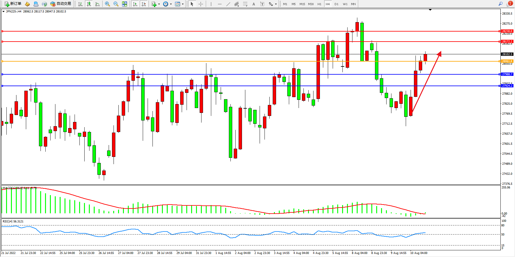 4小时图看:多头动力强势拉升向上移动,短期看涨情绪笼罩,MACD指标处于0轴线附近弱势徘徊,RSI指标处于50均衡线上側弱势徘徊;