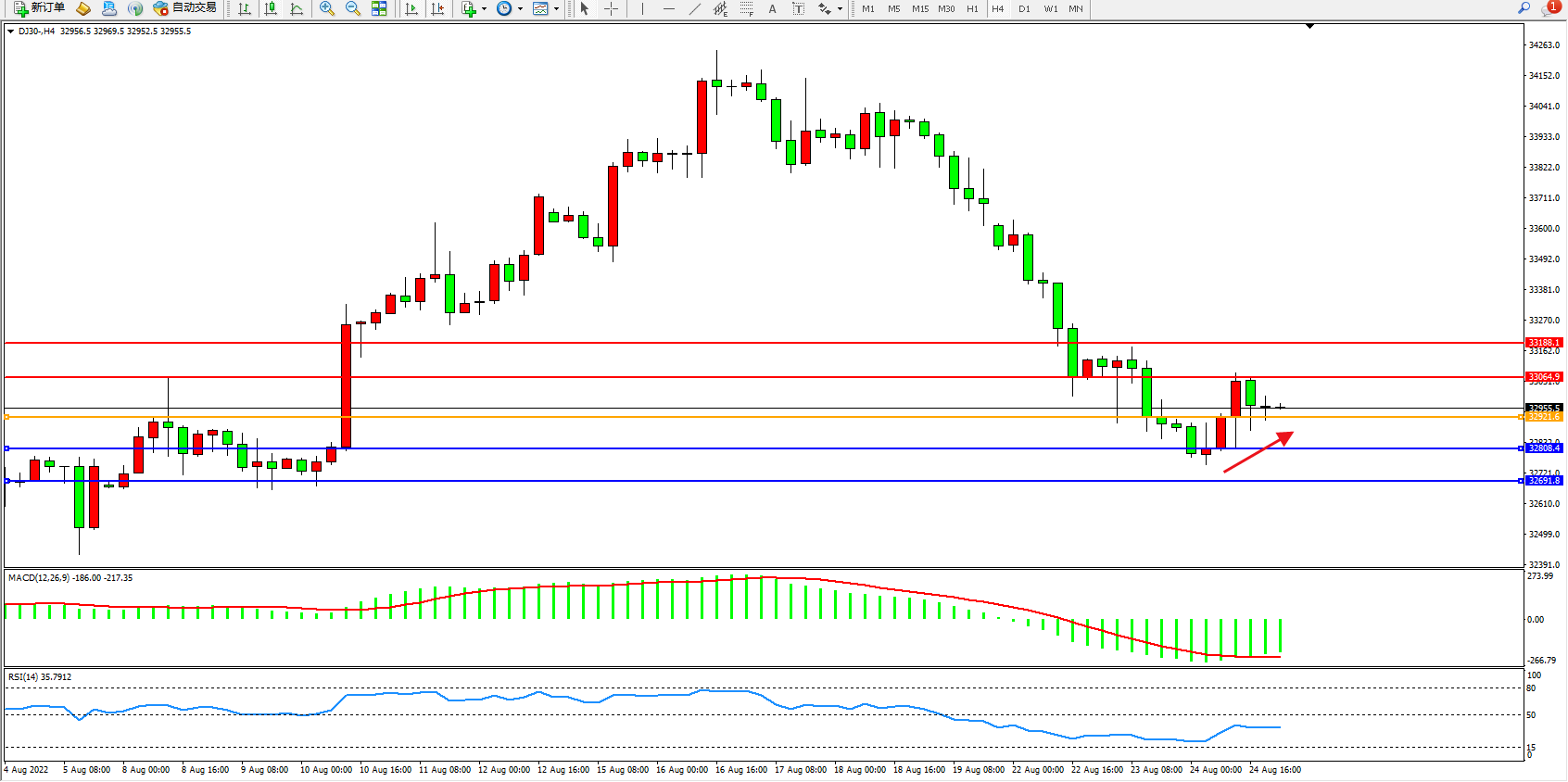 4小时图看:空头动力维持弱势震荡下行,低位短期震荡整理后,多头有伺机入场迹象,MACD指标处于空头区域维持弱势徘徊,RSI指标处于50均衡线下侧弱势整理;