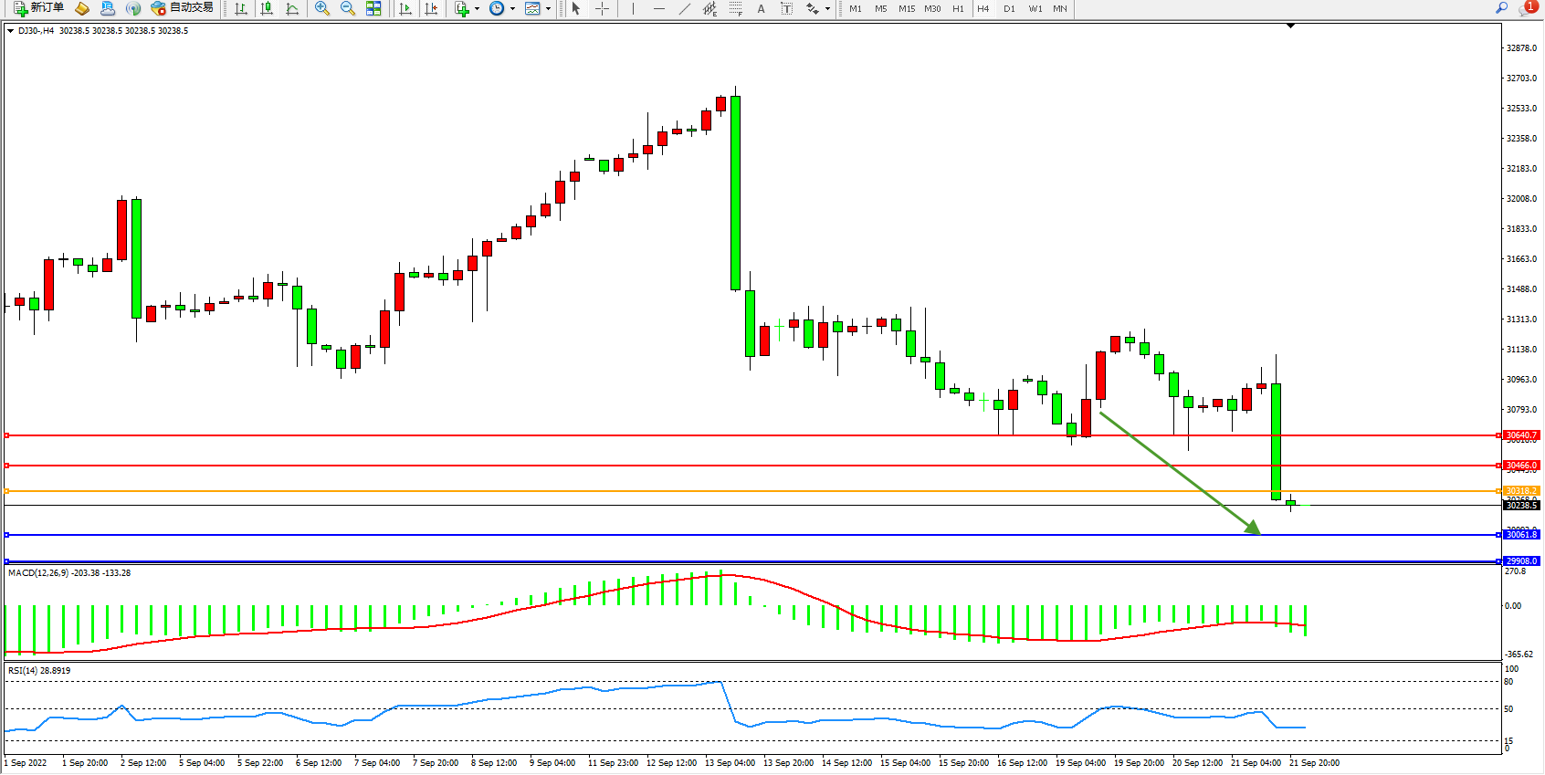 道琼斯指数9月21日(周三)收盘下跌522.52点,跌幅1.70%,报30183.71点;美联储将联邦基金利率目标区间提高75个基点,至3.00%-3.25%,并在最新预测中暗示会继续大幅度加息。