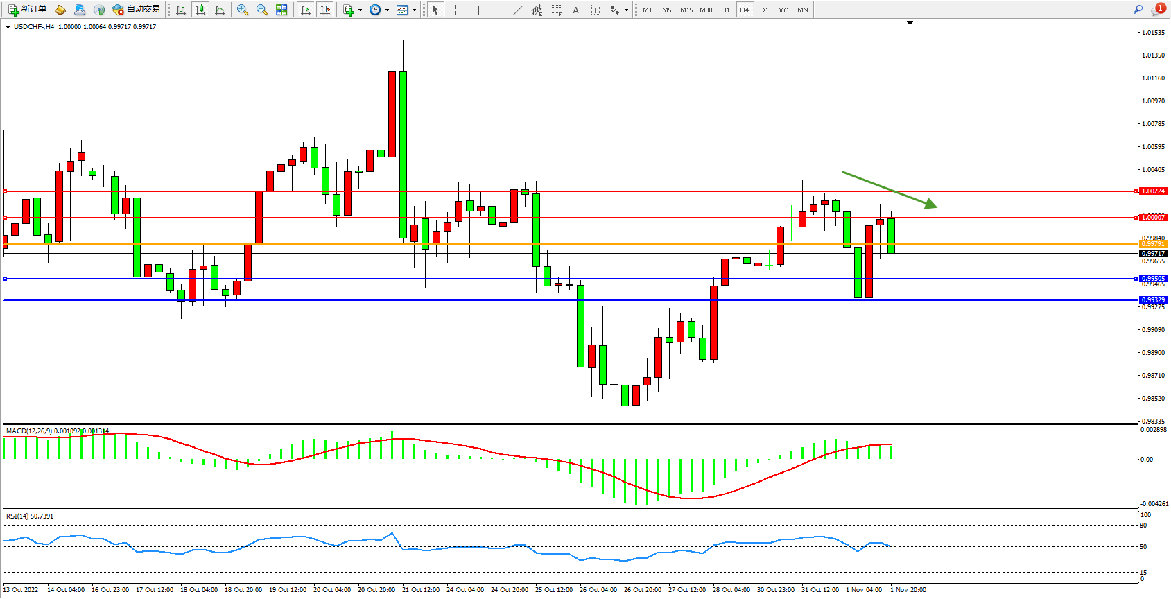 4小时图看:空头动力震荡回撤,短期有继续维持整理走势迹象,MACD指标处于0轴线上側整理平移,RSI指标处于50均衡线上側弱势徘徊;