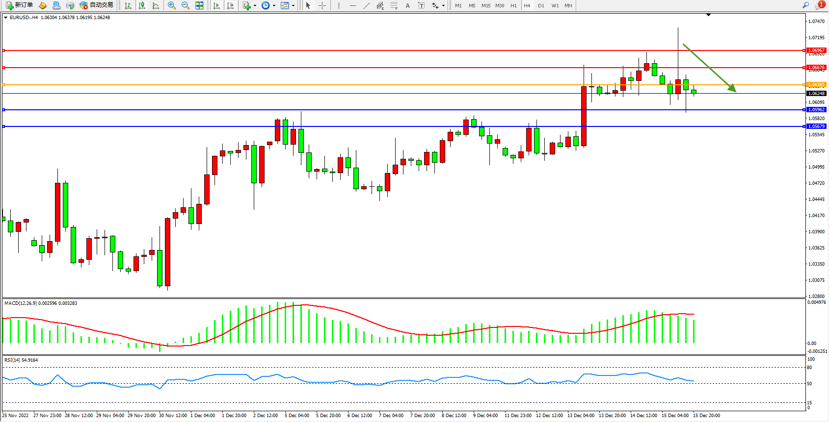 欧元美元EURUSD—4小时K线图显示: