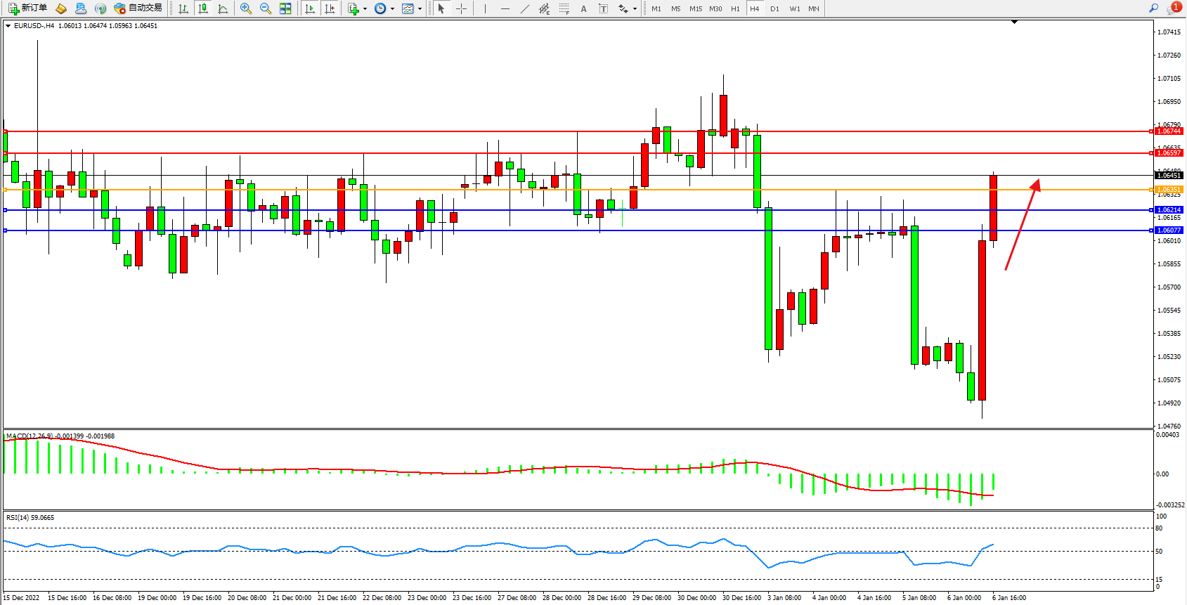欧元美元EURUSD—4小时K线图显示: