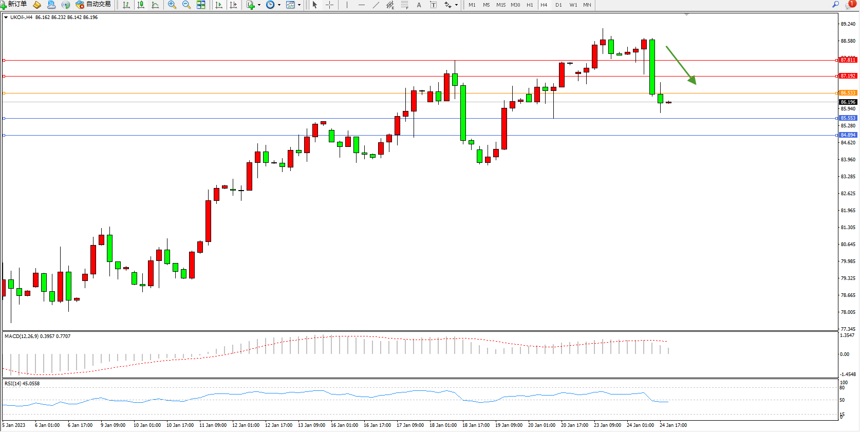 4小时图看:高位短期整理后,空头动力伺机入场,向下移动,短期跌势未见止步,市场空头情绪笼罩,MACD指标处于多头区域回撤,RSI指标处于50均衡线下侧弱势徘徊;