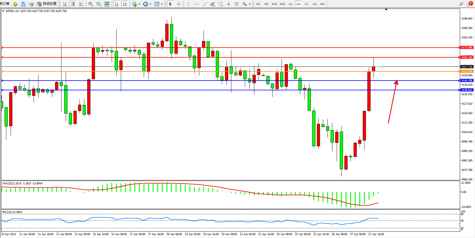 标普500指数4月27日(周四)收盘上涨78.51点,涨幅1.94%,报4134.50点;受近两年来最强劲的消费者支出支撑,美国第一季度实际GDP年化季率初值录得1.1%,实际个人消费支出季率初值录得3.7%,预估中值分别为2%和4%。