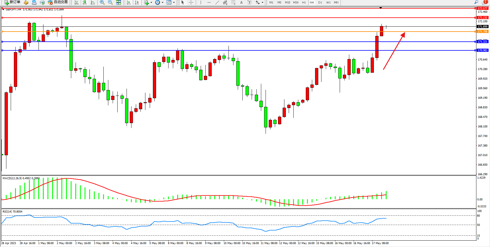 英镑兑日圆维持171.899附近震荡,市场定价显示,英国央行至少还有一次25个基点的加息,而且进一步加息的可能性很大,但上这一数据可能导致英国央行更加谨慎。