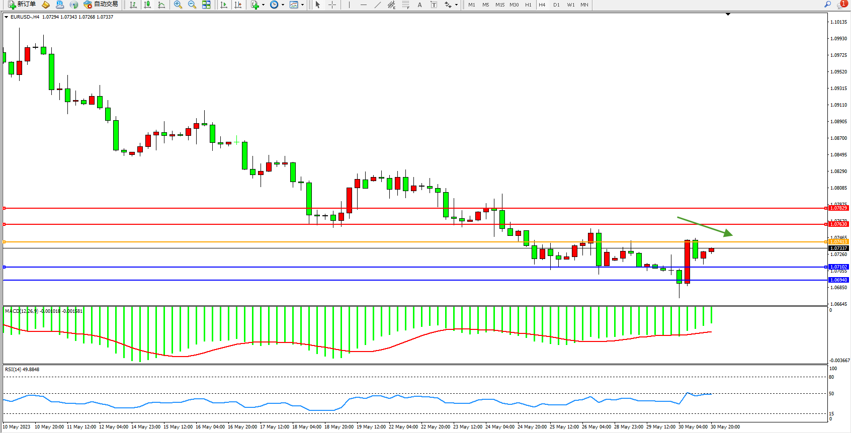 欧元美元EURUSD—4小时K线图显示: