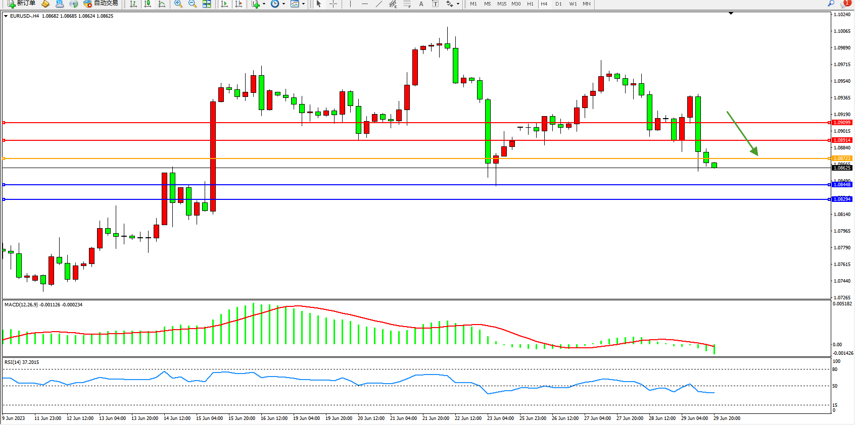 4小时图看:空头动力维持震荡下移,短期跌势或将持续,市场空头情绪笼罩,MACD指标处于0轴线下侧缓慢下移,RSI指标处于空头区域震荡;