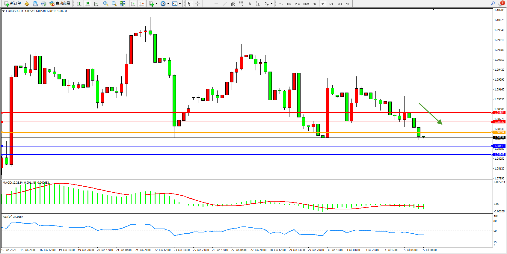欧元美元EURUSD—4小时K线图显示:
