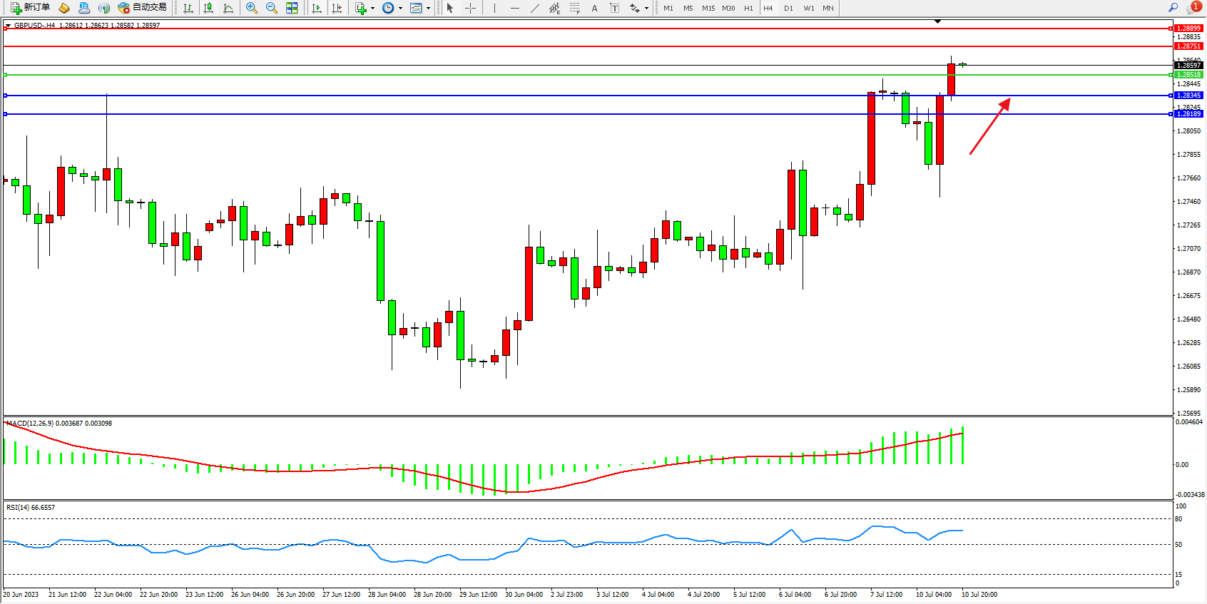 4小时图看:高位多头动力强势上扬,市场看涨情绪持续,多头不断拉升中,MACD指标处于多头区域高位震荡,RSI指标处于多头区域整理;