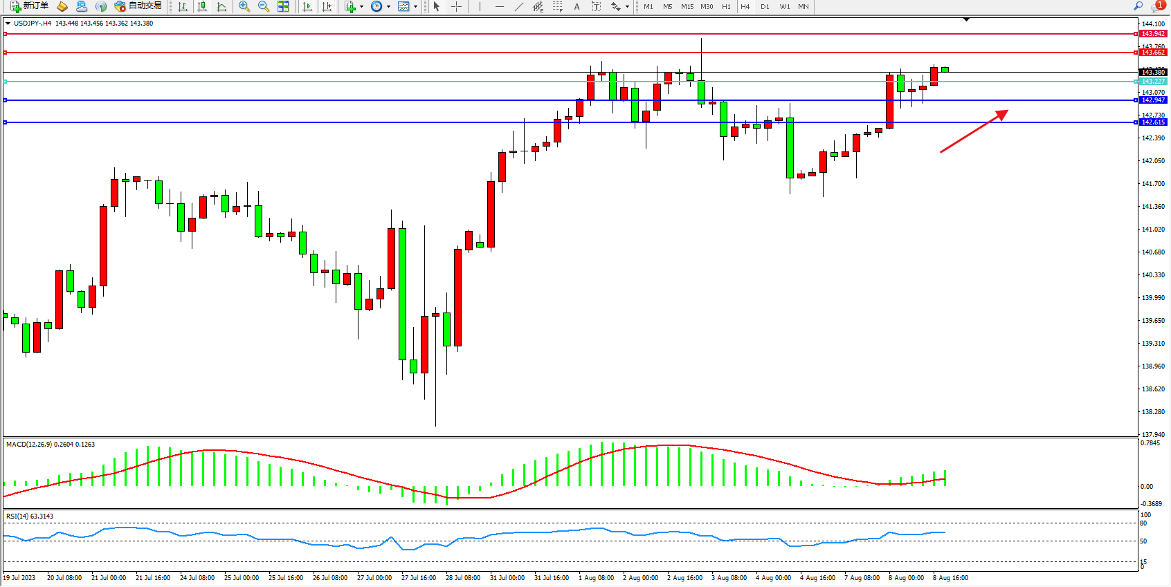 交易策略:143.227上方看涨,目标143.662 143.942
