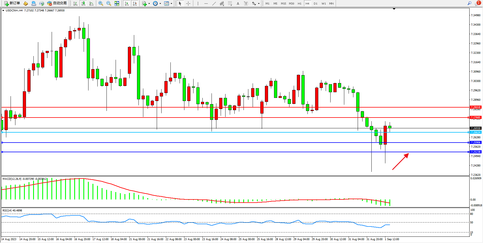 交易策略:7.26634上方看涨,目标7.27685  7.28418