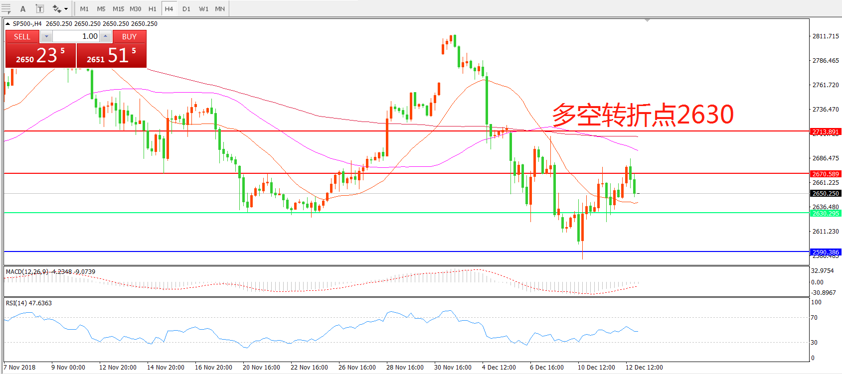 4小时图看,标普500连续下破关键支撑获得反弹,但整体价格直接跌至均线系统之下, MACD绿柱缩短,短期震荡整理的概率较大。