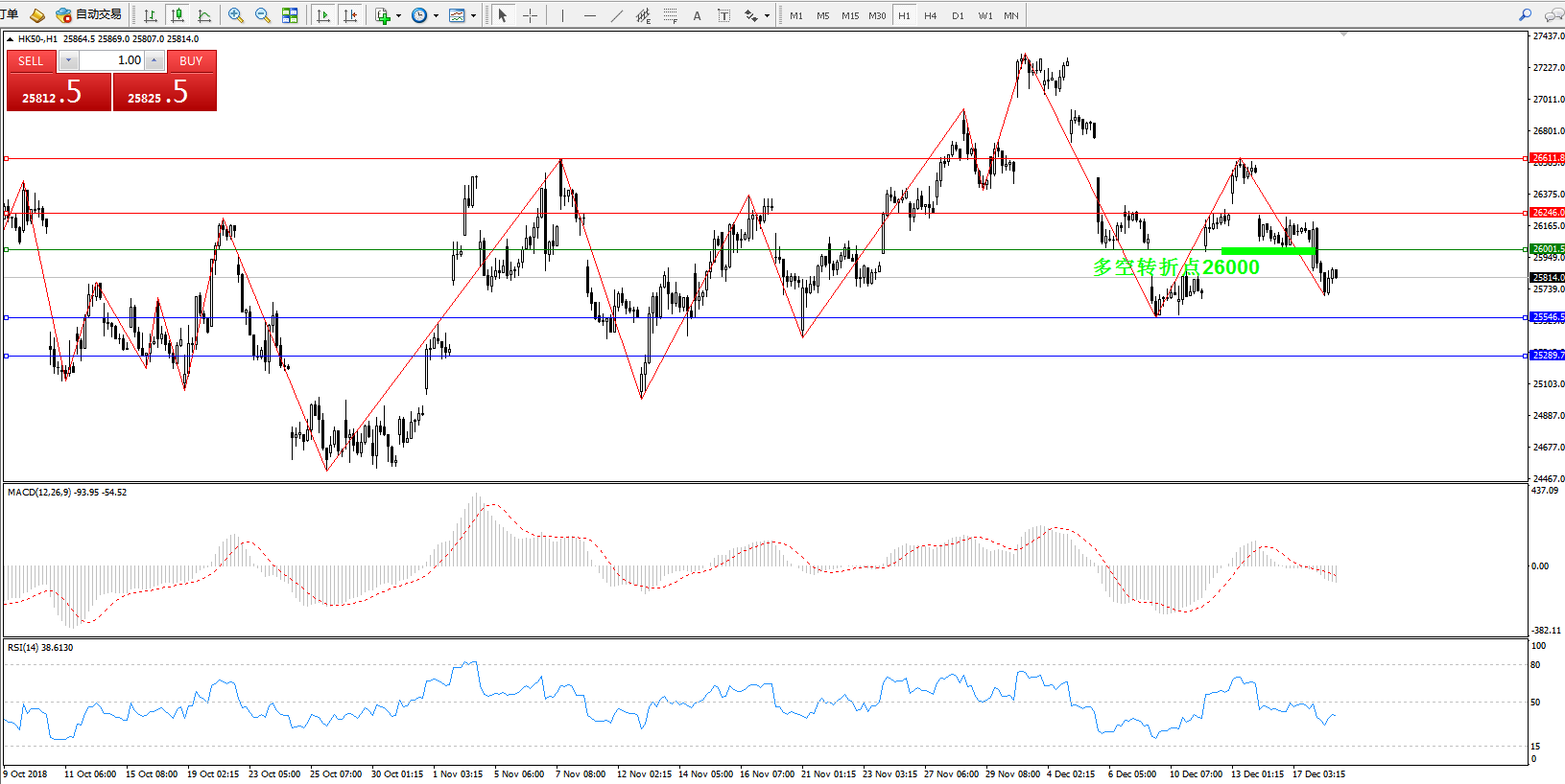 恒指HK50 ——1小时K线图显示: