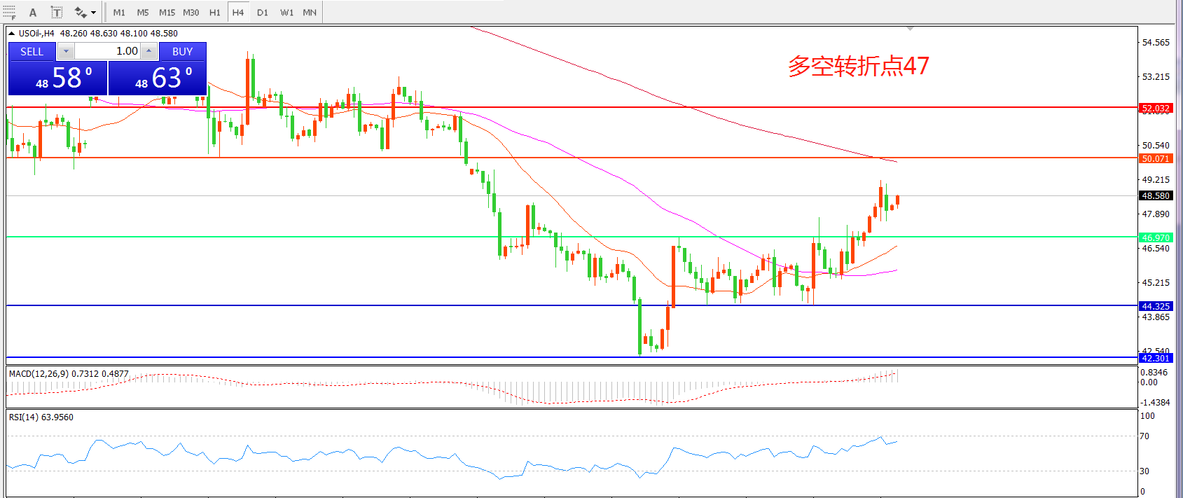 4小时图看,油价站稳47美金后稳步上行, 21与55均线形成金叉,MACD红柱增加,RSI指标拐头,日内反弹概率较大。