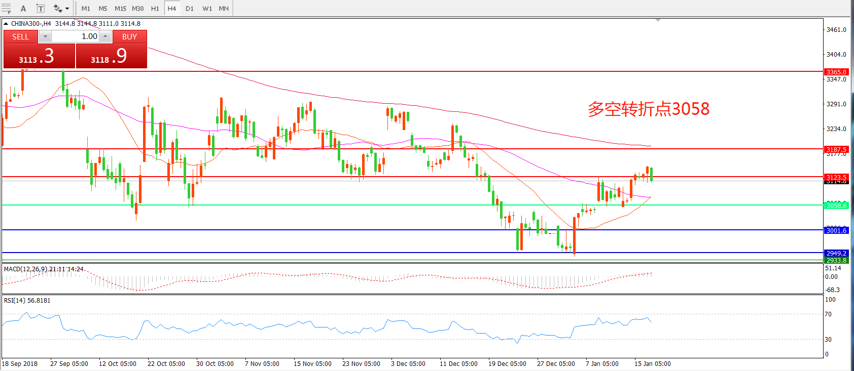 4小时图看,CHINA300中华指数站稳3058后陷入整理,日内如能站稳3123一线,反弹趋势即可确立, MACD绿柱减少,红柱增加,短期反弹成为可能。