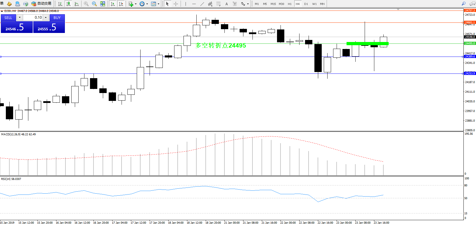 道琼斯指数DJ30—— 4小时K线图显示: