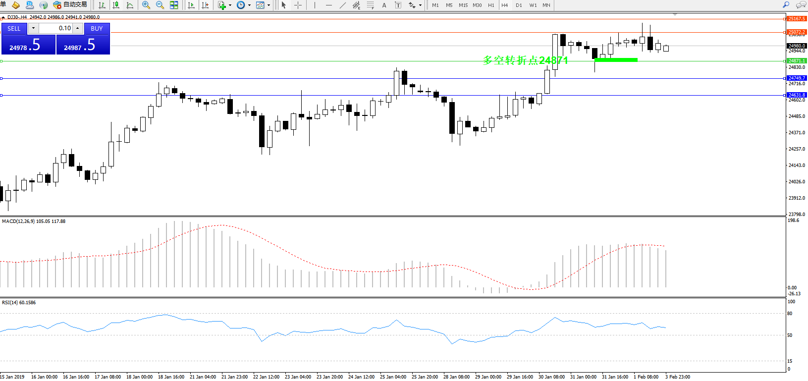 道琼斯指数DJ30—— 4小时K线图显示: