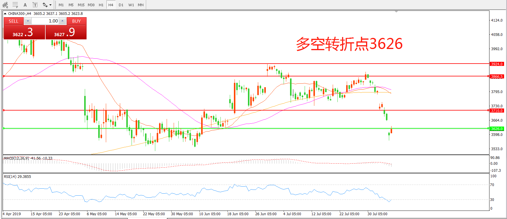 4小时图看,沪深300指数,跳空低开后小幅反弹,整体表现偏弱,均线粘合形成上方阻力,日内延续下行概率较大