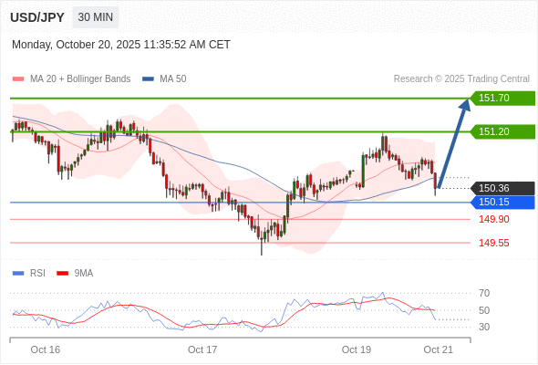 在 150.35 之上,看涨,目标价位为 151.20 ,然后为 151.70 。