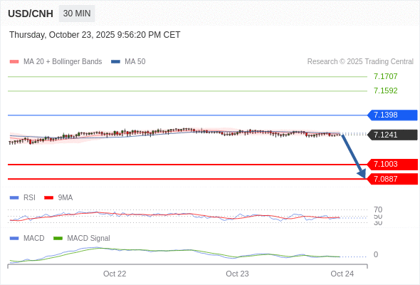 备选策略: 如突破 7.1398 ,USD/CNH 目标方向为 7.1592 和 7.1707 。