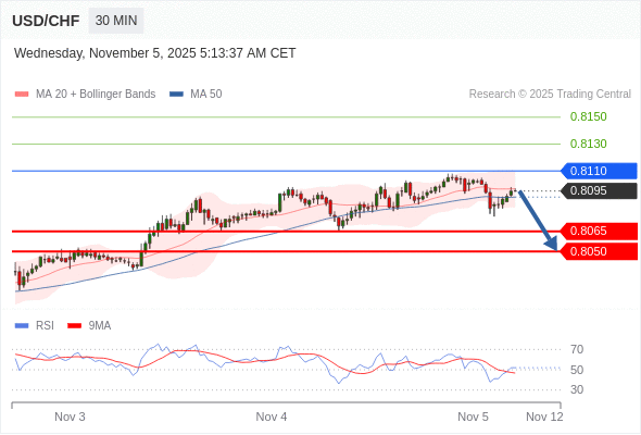 美元/瑞郎 当日内: 短期关键阻力位在0.8110。