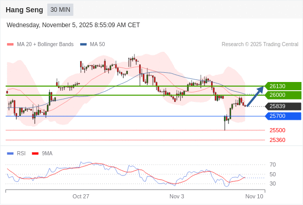 恒生指数 当日内: 超短线(当日内)支撑位在25700附近。