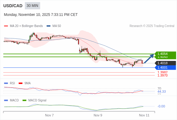 美元/加元 当日内 : 有上涨的可能,目标价位定在 1.4054 。