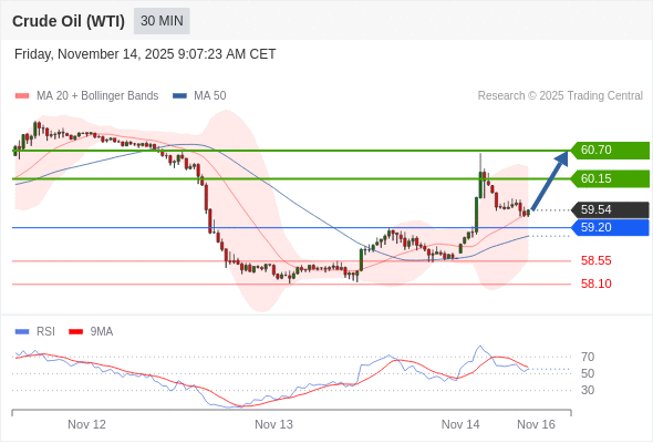 在 59.20 之上,看涨,目标价位为 60.15 ,然后为 60.70 。