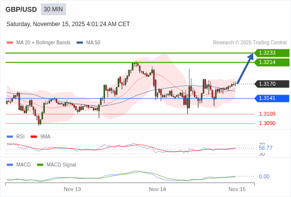 英镑/美元 当日内 : 看涨,当 1.3141 为支撑位。