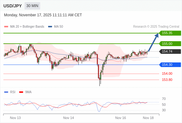 在 154.30 之上,看涨,目标价位为 155.00 ,然后为 155.35 。