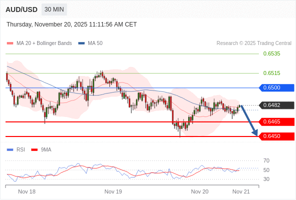 在 0.6500 之下,看跌,目标价位为 0.6465 ,然后为 0.6450 。