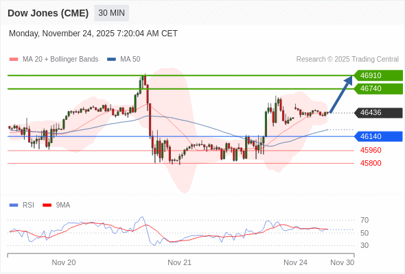 在 46140 之上,看涨,目标价位为 46740 ,然后为 46910 。