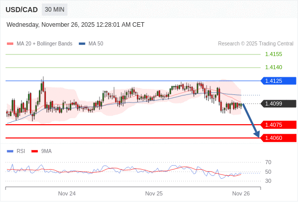 在 1.4125 之下,看跌,目标价位为 1.4075 ,然后为 1.4060 。