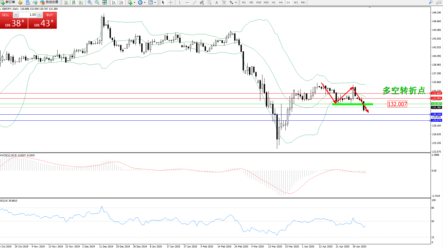 交易策略:132.007下方看跌,目标130.144129.074