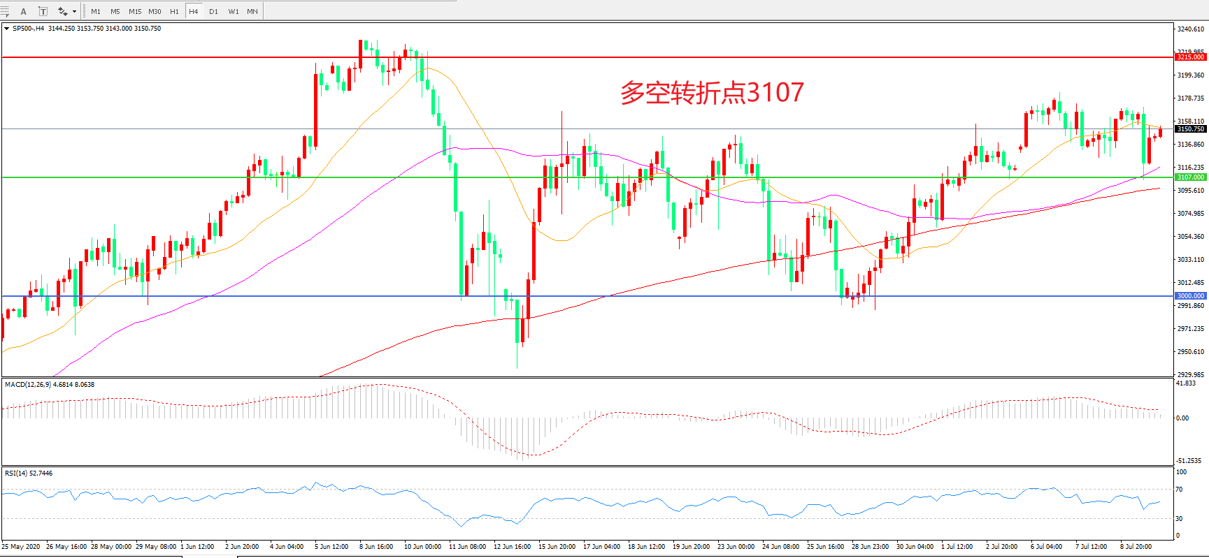 4小时图看,标普500延续高位震荡,整体走势偏强,均线系统走平, MACD红柱减少,RSI指标走平,日内延续震荡概率较大。