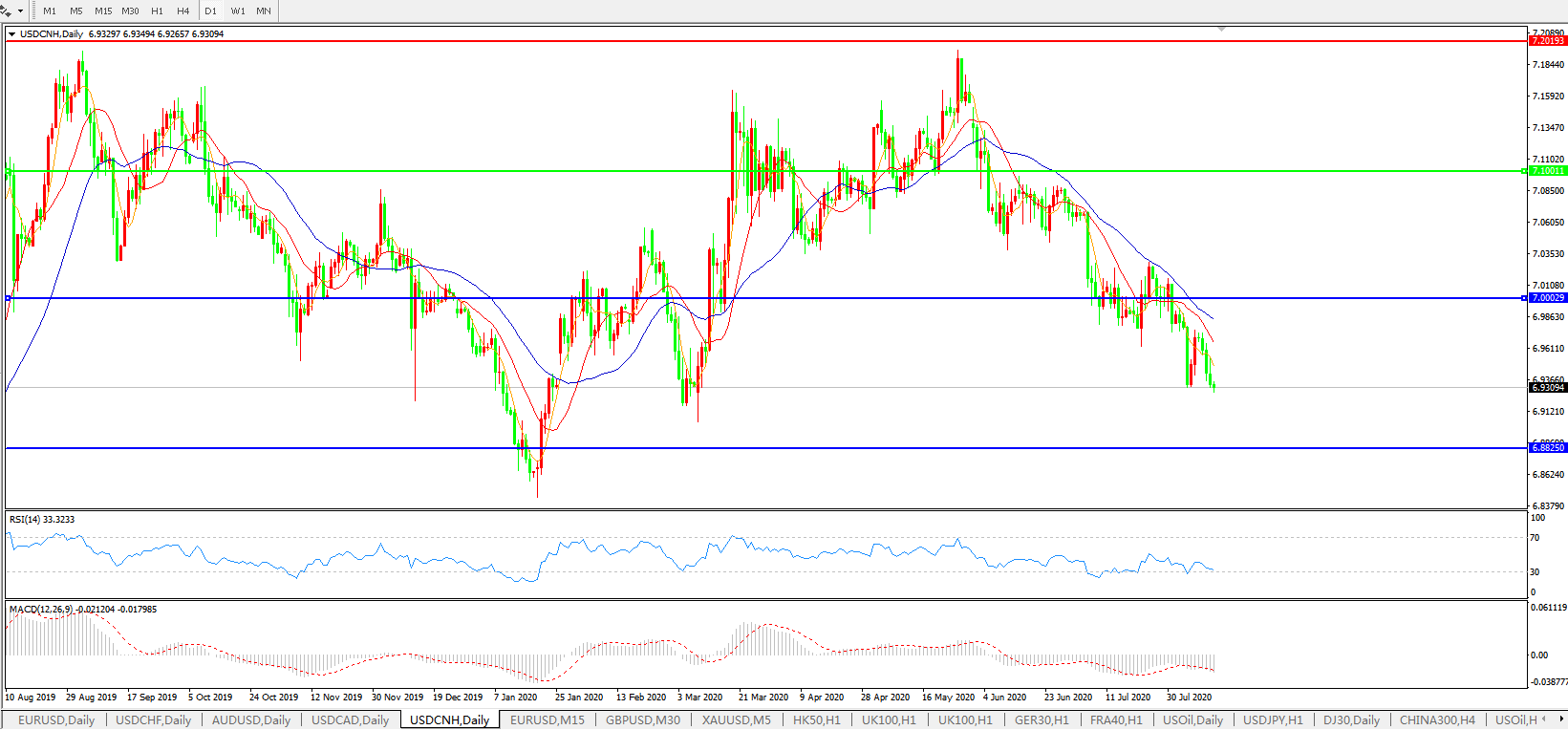 美元兑人民币USDCNH 日线图: