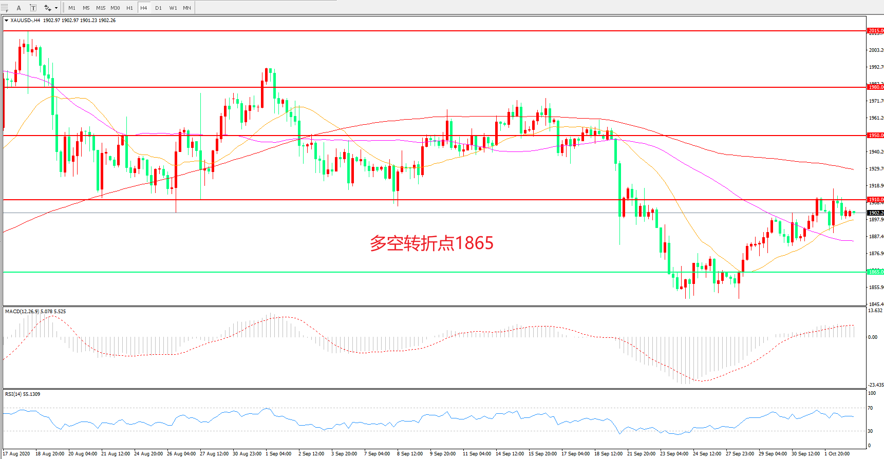 4小时图看,金价以触及1865支撑后震荡上行,短期走势有所回暖,1910成为短期阻力,21周期均线成为短期支撑,MACD红柱增加,RSI指标走平,近期延续上行概率较大。